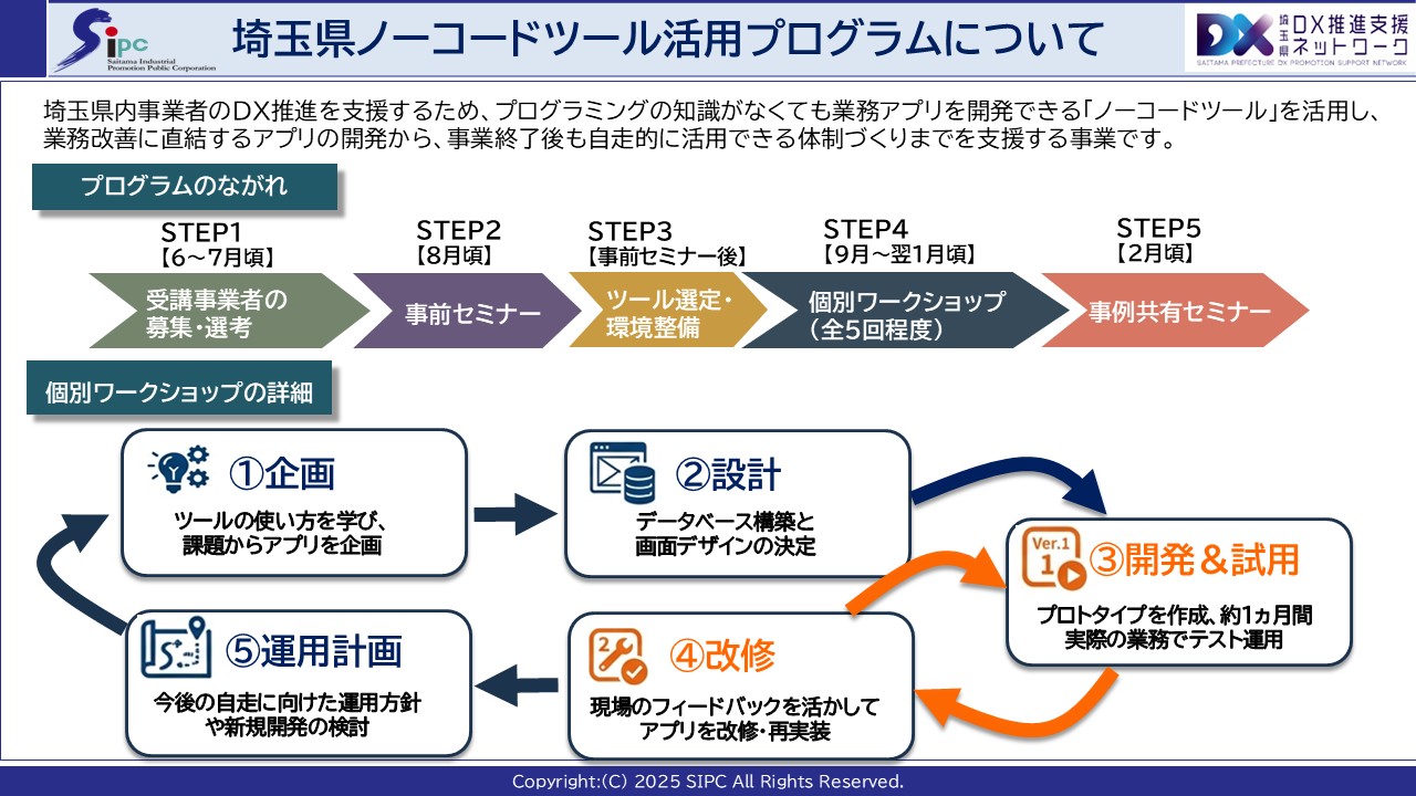 令和7年度 埼玉県ノーコードツール活用プログラムは、募集を終了しました。多数のご応募をいただき、誠にありがとうございました。