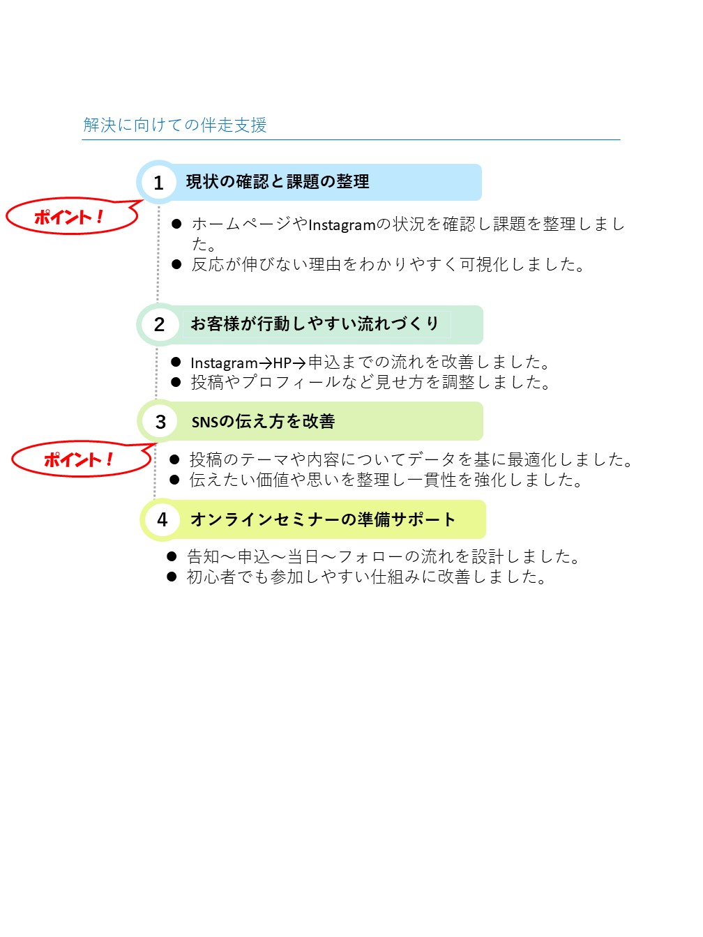 見込まれる効果 ・投稿内容やハッシュタグ戦略を改善し、フォロワー増加と反応率向上の基盤を作った。 ▶データを活用した改善サイクルの導入される ・ InstagramインサイトやGoogle Analytics(※5)を使い、PDCAを回す仕組みを導入。 ▶デジタル集客の導線が整う ・Instagram・ホームページ・LPを連携させ、問い合わせや申込みにつながる仕組みを構築。 ▶オンライン施策の実行力が高まる ・ Zoomセミナーや告知方法の整備により、遠方や新規顧客へのアプローチが可能になった。