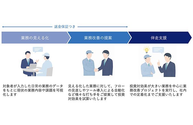 ・DX/AI活用のコンサルティングおよび伴走支援 ・業務棚卸による見える化から効率化提案まで返金保証で実施 ・システム開発・導入からAI研修まで課題に即したソリューションの実行