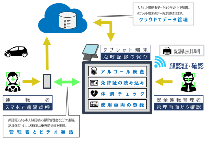 ・タブレットを使用し、点呼業務(アルコールチェック)における規則改定の対策とデジタル化を支援するシステムです。