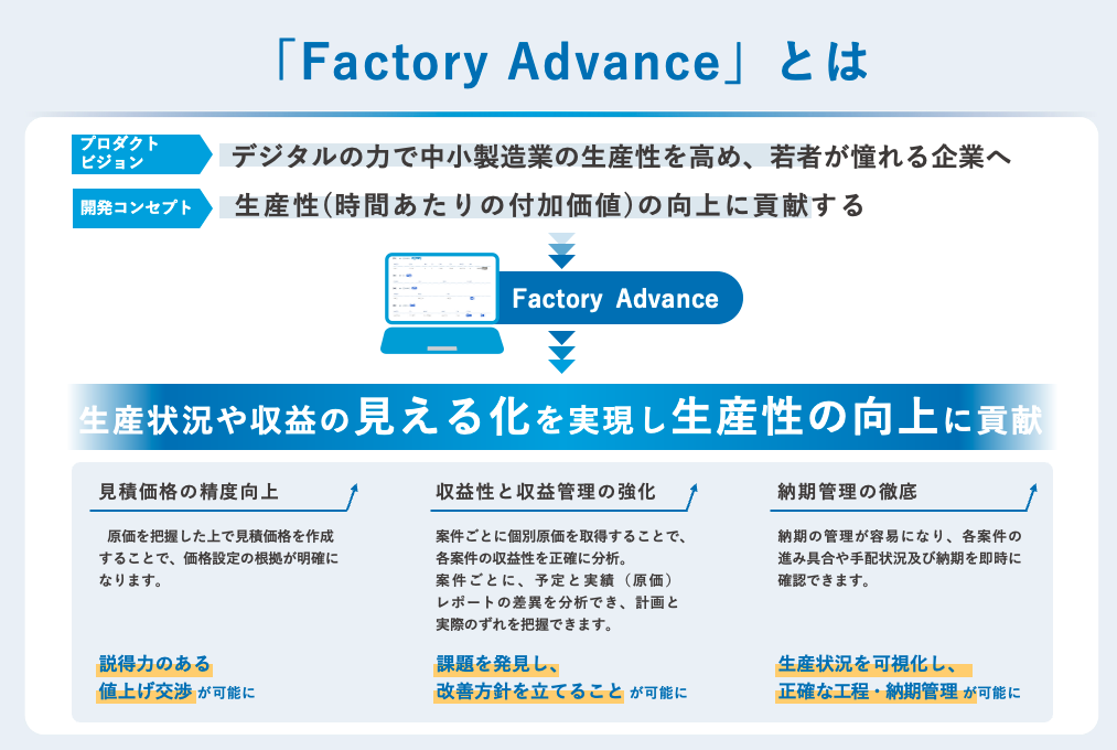 ・「FactoryAdvance」は、20名以下の小規模製造業が使いやすくかつ生産性を向上させるための機能の充実を目指しています。