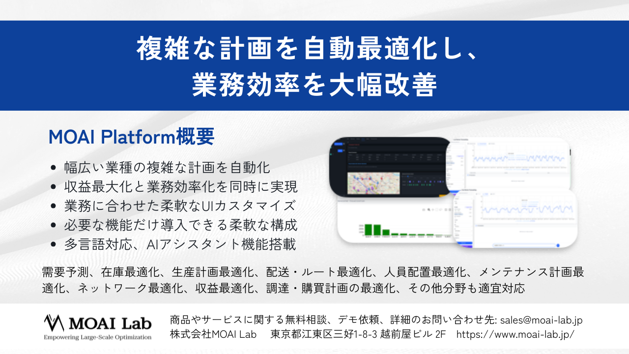 MOAI Platform は、製造業をはじめとするサプライチェーン分野を中心に、サービス業など幅広い業種の複雑な計画を自動で最適化し、ムダ削減・納期遵守・業務効率化を実現するソリューション群です。