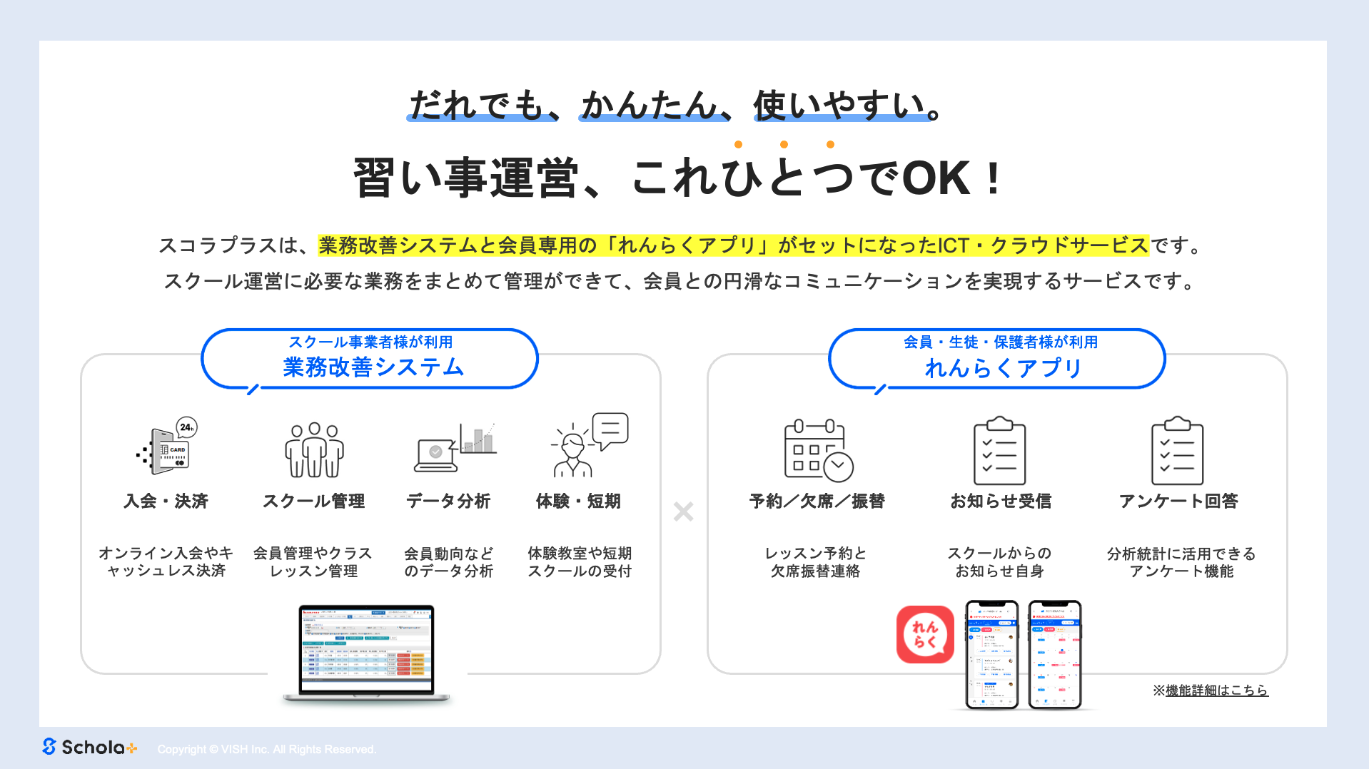 ・欠席・遅刻・振替申請、各種連絡(お知らせ配信・個別連絡・アンケート等)をアプリ・Webでオンライン化し、電話・紙・Excel運用を削減。