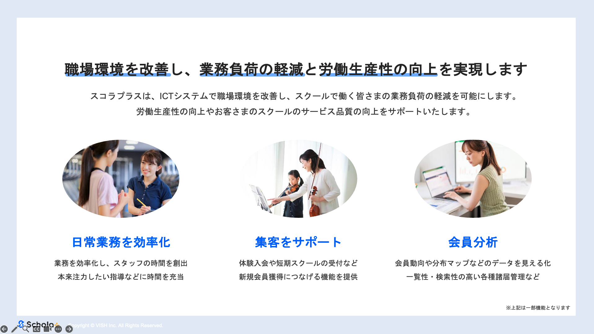 ・会員情報/申込(体験・入会)/クラス・コース/予約・定員など、教室・施設運営の基盤業務をクラウドで一元管理。