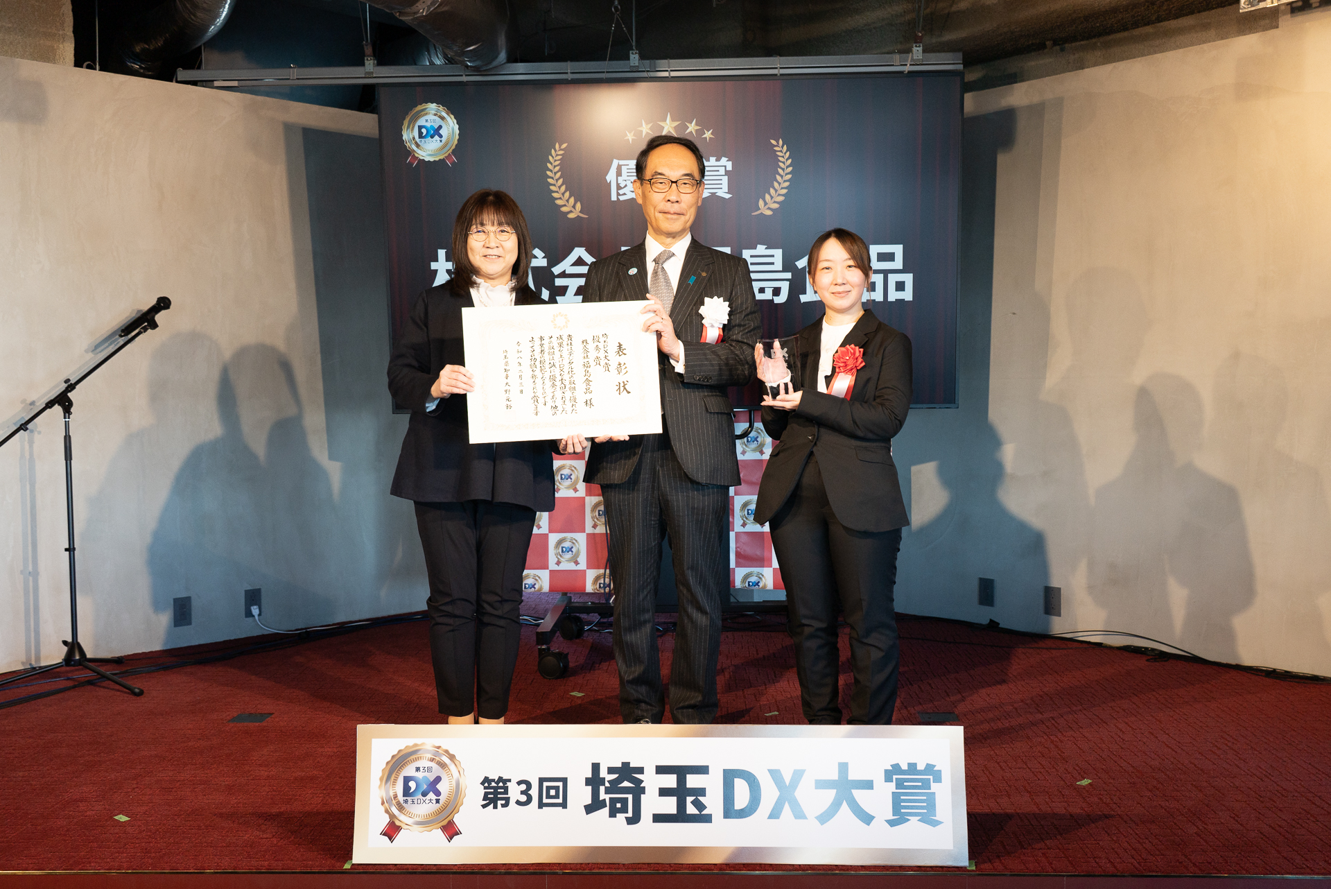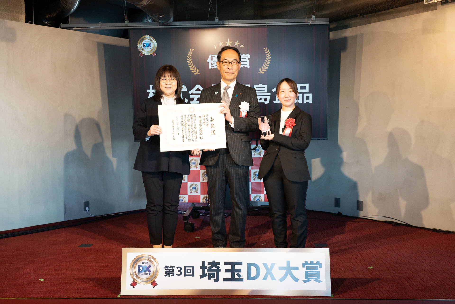 受賞事業者を代表して、最優秀賞の株式会社ヤマザキライス、優秀賞の株式会社福島食品、有限会社比企オプティクスの3社より、