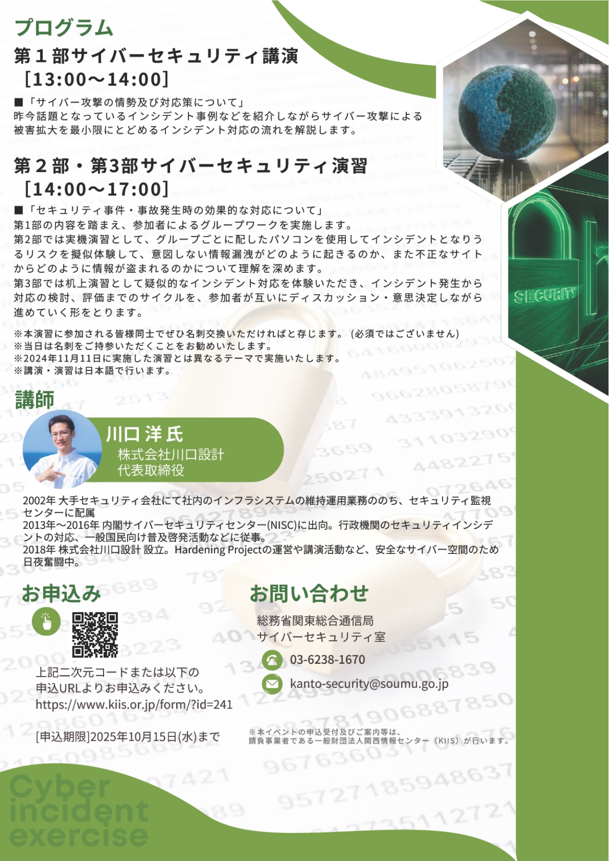 そこで、中小企業・団体等の方を対象に、最近のサイバーセキュリティインシデントの発生状況や、被害を最小限にとどめるための基本的事項を学び、疑似的なインシデント発生時の対応手順を体験することにより、組織内の基本方針やルールなどを考えていただくことを目的として「サイバーインシデント演習」を開催します。演習では、グループワークによる机上演習に加え、パソコンを使用してインシデントとなりうるリスクを疑似体験いただきます。