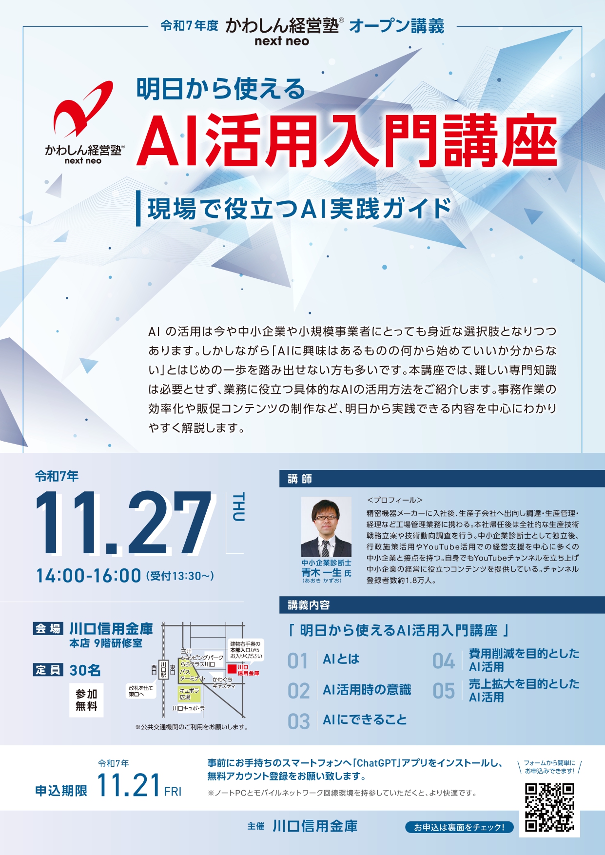 メリット 費用削減、売上拡大に向けて明日から実践できるAI活用方法を学べます。 中小企業支援実績が豊富な専門家から実践的なアドバイスが得られます。 経営塾を機として、受講生同士でのネットワークを広げることができます。