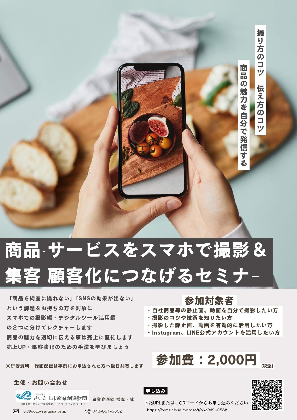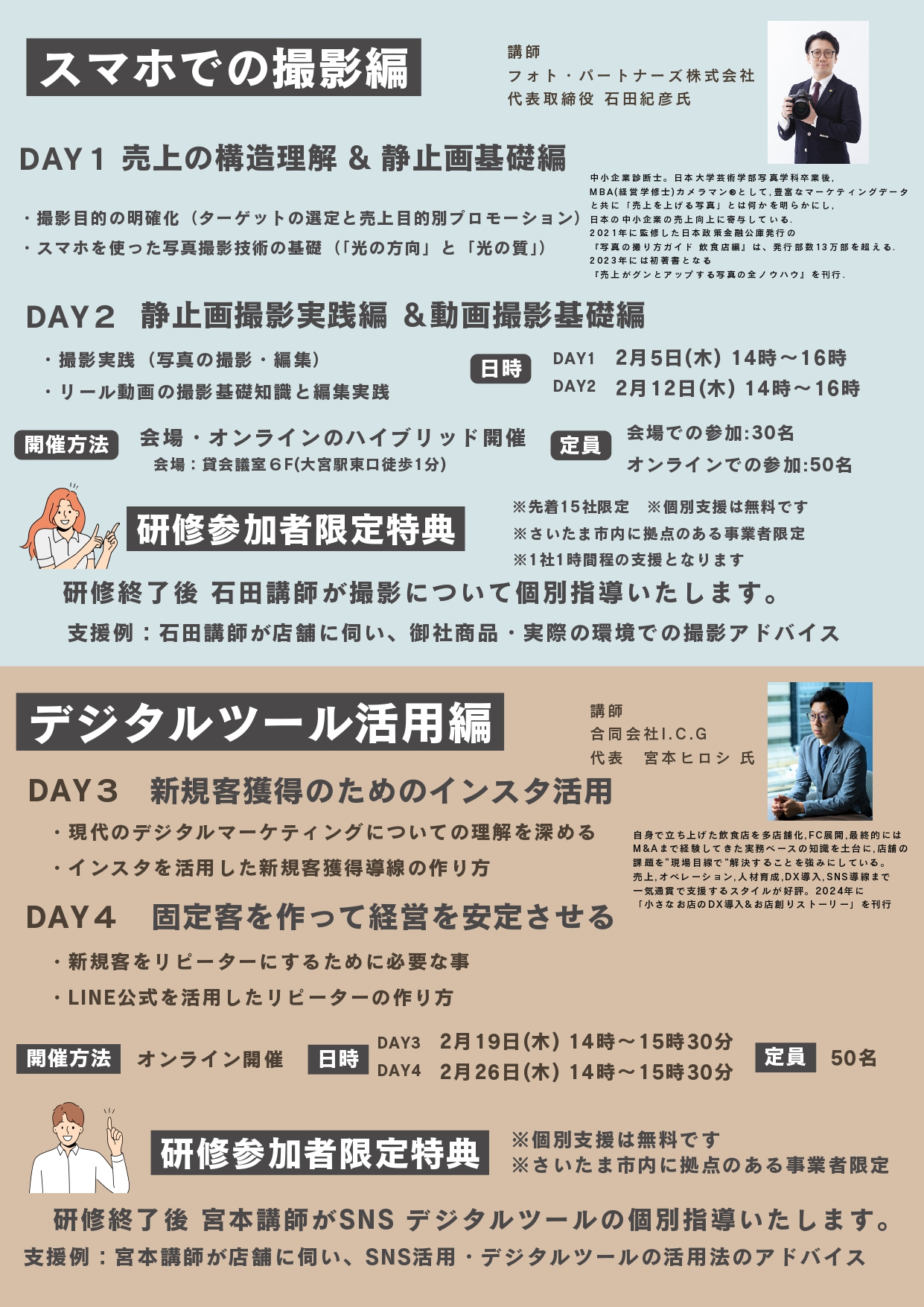 「商品を綺麗に撮れない」「SNSの効果が出ない」という課題をお持ちの方を対象にスマホでの撮影編・デジタルツール活用編の2つに分けてレクチャーします。